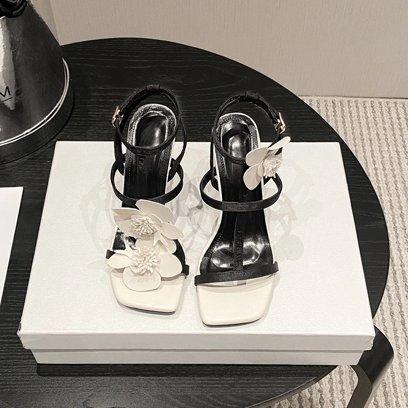 Um Sandália Salto Agulha de Couro PU Floral - Noir et Blanc Fleur