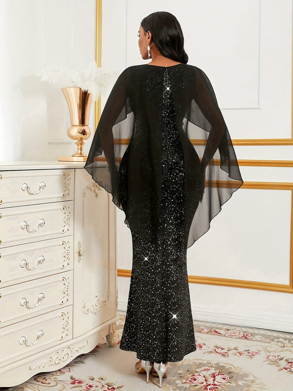 O vestido em Paetê com Pelerine longo evoca leveza, mistério e um toque poderoso com um caimento impecável.