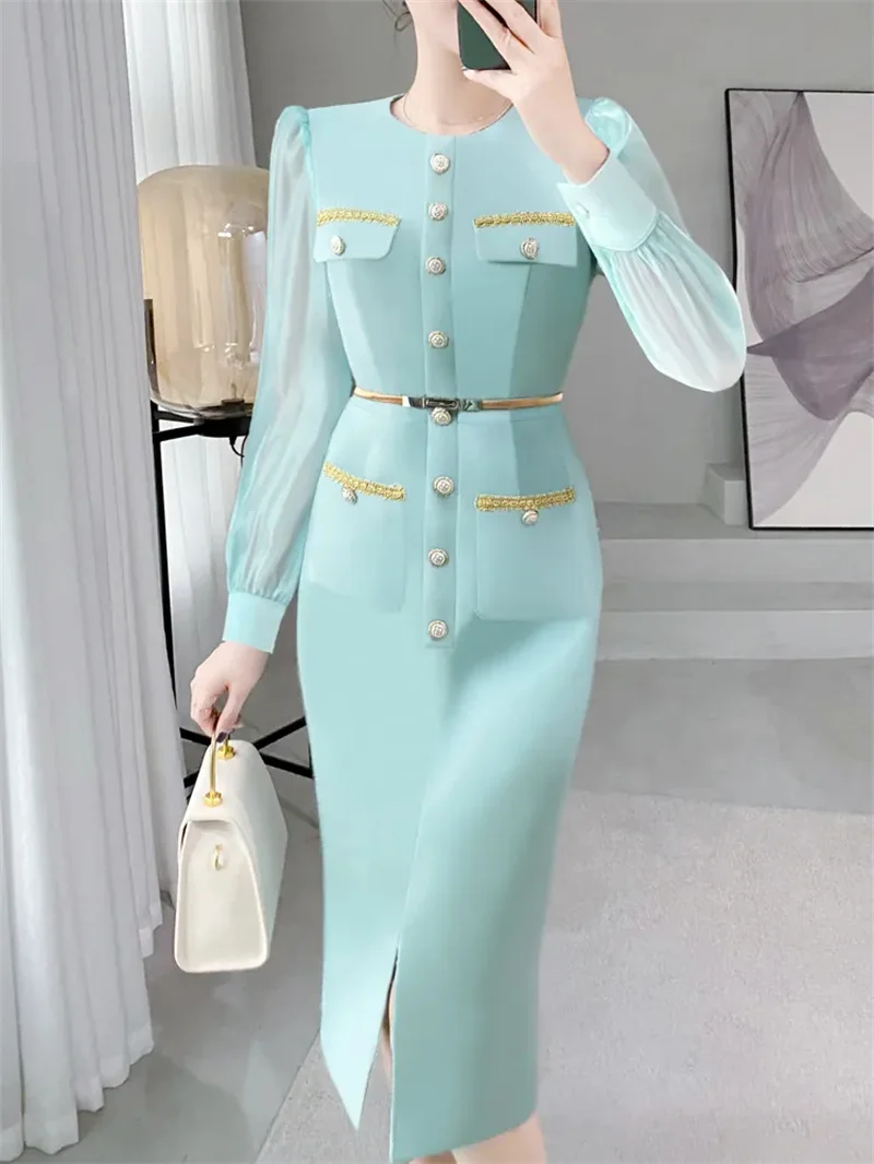 O verde água traduz frescor e serenidade, enquanto os detalhes dourados ecoam nobreza e refinamento. Os quatro bolsos frontais trazem um toque de ousadia e modernidade, e o cinto delicado marca a silhueta com precisão, realçando suas formas com sutileza. As mangas de organza adicionam leveza, criando um contraste irresistível entre estrutura e fluidez.